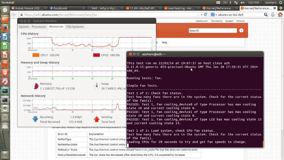 Results generated by fwts: Version V0.25.06precise1 (Tue Sep 4 12:56:28 CST 2012). Some of this work - Copyright (c) 1999 - 2010, Intel Corp. All rights reserved. Some of this work - Copyright (c) 2010 - 2012, Canonical. This test run on 23/03/14 at 19:07:37 on host Linux azh 3.11.0-15-generic #25~precise1-Ubuntu SMP Thu Jan 30 17:39:31 UTC 2014 x86_64. Running tests: fan. Simple Fan Tests. ------------------------------------------------------------------------ Test 1 of 2: Check fan status. Test how many fans there are in the system. Check for the current status of the fan(s). PASSED: Test 1, Fan cooling_device0 of type Processor has max cooling state 10 and current cooling state 0. PASSED: Test 1, Fan cooling_device1 of type Processor has max cooling state 10 and current cooling state 0. PASSED: Test 1, Fan cooling_device2 of type LCD has max cooling state 15 and current cooling state 13. Test 2 of 2: Load system, check CPU fan status. Test how many fans there are in the system. Check for the current status of the fan(s). Loading CPUs for 20 seconds to try and get fan speeds to change. Fan cooling_device0 current state did not change from value 0 while CPUs were busy. Fan cooling_device1 current state did not change from value 0 while CPUs were busy. ADVICE: Did not detect any change in the CPU related thermal cooling device states. It could be that the devices are returning static information back to the driver and/or the fan speed is automatically being controlled by firmware using System Management Mode in which case the kernel interfaces being examined may not work anyway. ======================================================================== 3 passed, 0 failed, 0 warnings, 0 aborted, 0 skipped, 0 info only. ======================================================================== 3 passed, 0 failed, 0 warnings, 0 aborted, 0 skipped, 0 info only. Test Failure Summary ======================================================================== Critical failures: NONE High failures: NONE Medium failures: NONE Low failures: NONE Other failures: NONE Test |Pass |Fail |Abort|Warn |Skip |Info | ---------------+-----+-----+-----+-----+-----+-----+ fan | 3| | | | | | ---------------+-----+-----+-----+-----+-----+-----+ Total: | 3| 0| 0| 0| 0| 0| ---------------+-----+-----+-----+-----+-----+-----+ azuharu@azh:~$Meskipun hasilnya tidak ada masalah dengan fan, tapi tetap saja saya masih penasaran. Oleh karena itu jika teman-teman paham tentang kenapa laptop cepat panas, mungkin bisa beritahu saya juga hehe Sekian post tentang Laptop cepat panas saat menggunakan Ubuntu, dan bagaimana mengecek firmware dengan FWTS. Semoga bermanfaat.