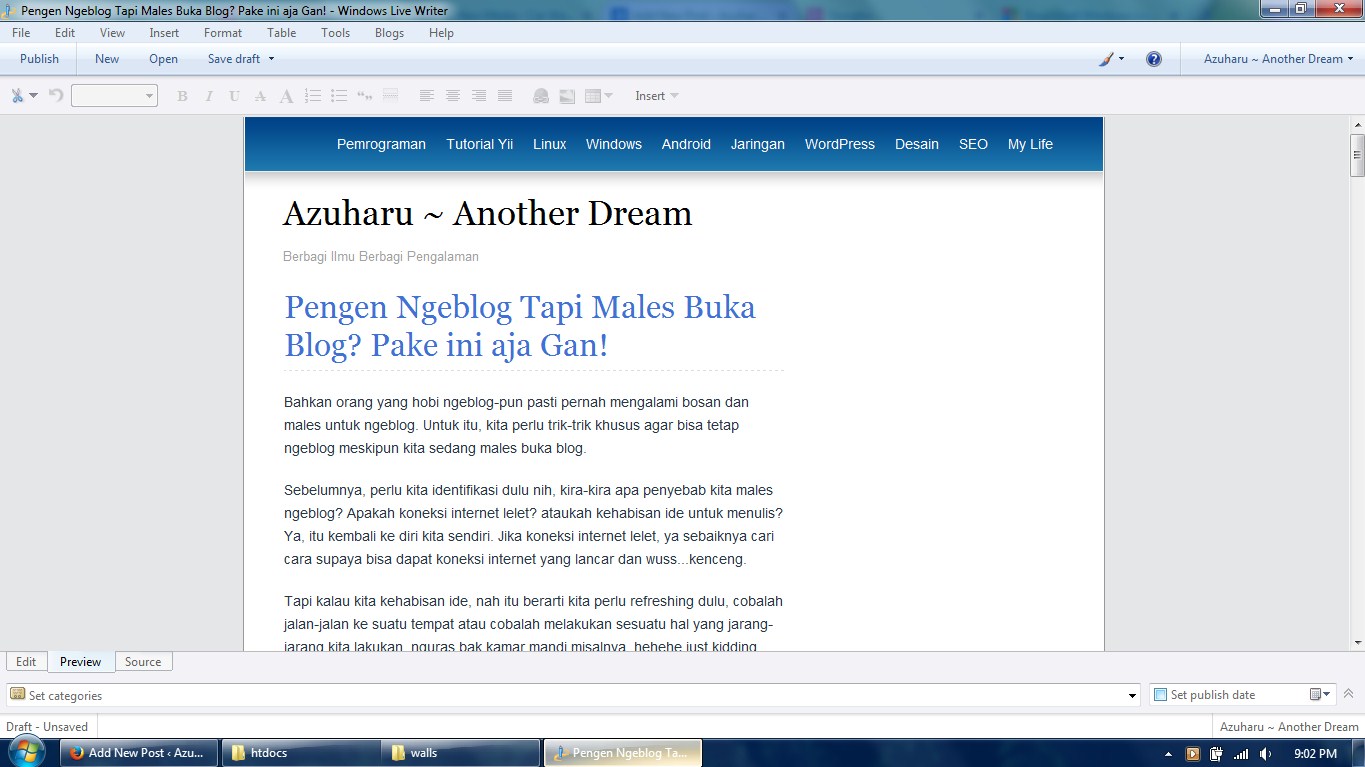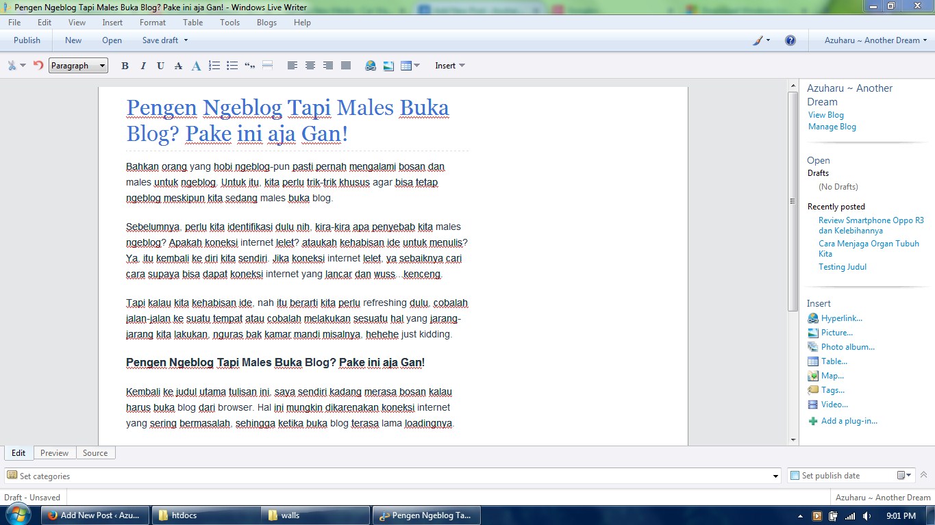 Kembali ke judul utama tulisan ini, saya sendiri kadang merasa bosan kalau harus buka blog dari browser. Hal ini mungkin dikarenakan koneksi internet yang sering bermasalah, sehingga ketika buka blog terasa lama loadingnya. Untuk menyikapi hal seperti itu, saya mencoba untuk ngeblog tanpa harus buka blog dari browser. Penasaran bagaimana caranya? Ya, mungkin Anda sudah pernah dengar software yang satu ini: Windows Live Writer, kalau belum berarti kebetulan sekali!